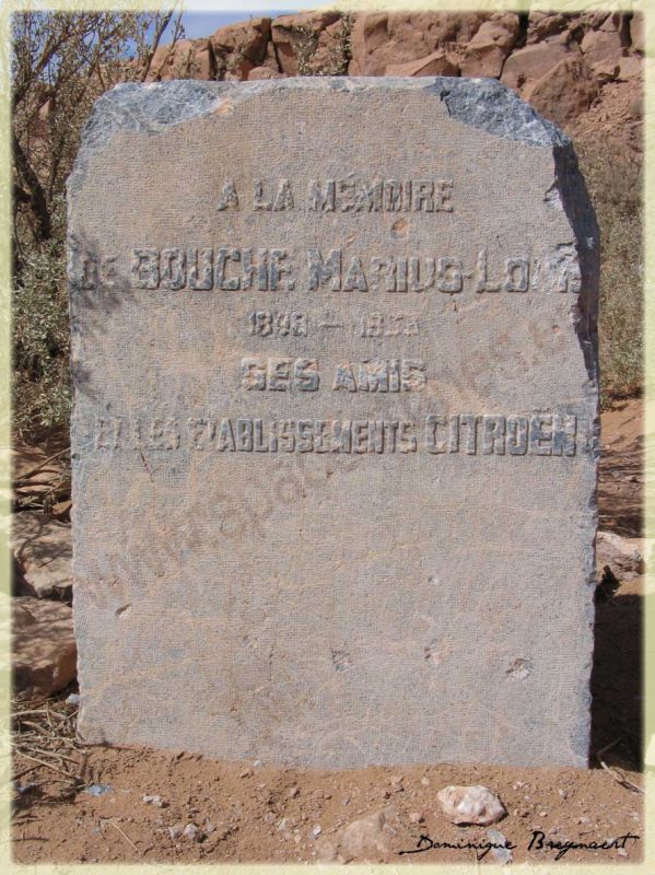 Au point N 31° 37,409’ – W 04° 3,974’, Stéle en granit avec comme inscription : ‘’ À la mémoire de BOUCHE Marius-Louis – 1898 – 1933. Ses Amis et les établissements CITROËN ’’.