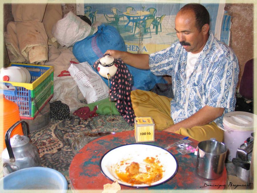 Maroc, le 4 Septembre 2007. Hospitalité Marocaine. Gardien d'oiseau avec qui j'ai partagé son assiette de Tagine avant le thé.