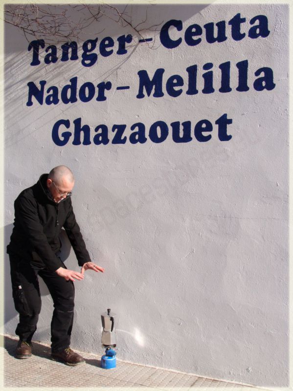 Le 19 Décembre 2009 sur la route en Espagne, non je ne fait pas d'incantations à ma cafetière merveilleuse, je prépare juste un petit café avant de reprendre la route en direction du Maroc.